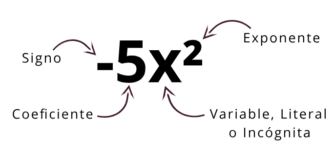 Expresión conformada por un coeficiente con su respectivo signo (positivo o negativo), una o más variables o literales, que representan números desconocidos, y exponentes.
