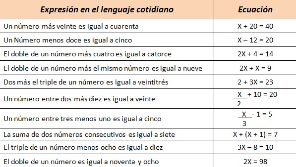 A continuación, en las tablas siguientes se muestran las traducciones de lenguaje cotidiano o común a lenguaje algebraico: